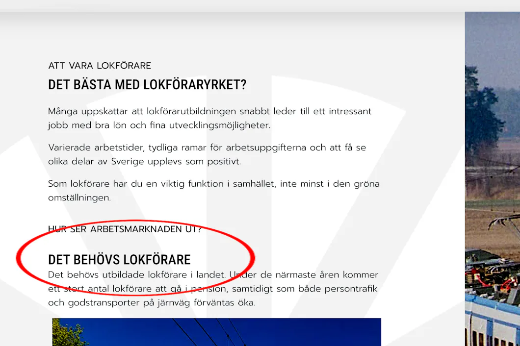 I annonsen för Norges Yrkeshögskola står det också att ”Sverige har för närvarande en betydande brist på lokförare.”