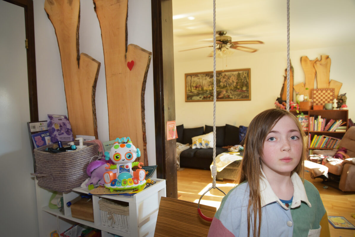 En 9-årig tjej sitter vid fönstret och tittar på kameran. Det växer ett stort träd utanför.