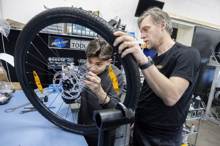 Det är mycket svårt att byta ut frihjulskroppen på en mountainbikes baknav. 15-årige Denis Asanovich snurrar på en hylsnyckel.