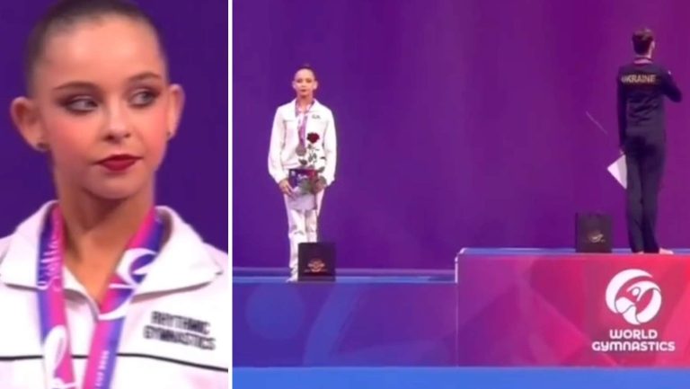 Det är på grund av hennes agerande på pallen. Ilteriakova vände sig bort när den ukrainska nationalsången spelades.