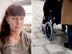 Den delade bilden innehåller ett foto på Linda Jatko till vänster och en bild på en sjuksköterska som drar en person i rullstol till höger.