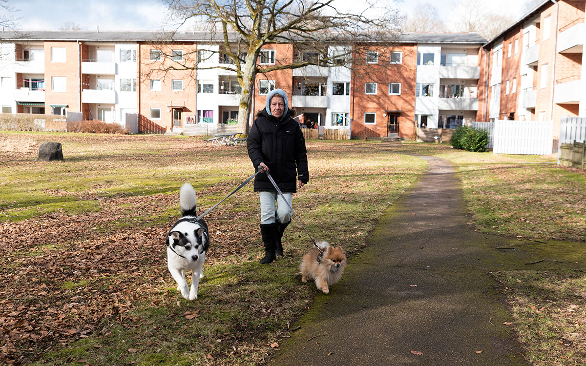 Janet Carlson går en promenad med sina hundar, Panda och Baloo. Sedan november 2025 bor hon i det lummiga bostadsområdet Skogvaktalen med sin hyresvärd Kupolen. Hon var tvungen att lämna en annan civil värds gamla lägenhet eftersom den läckte.