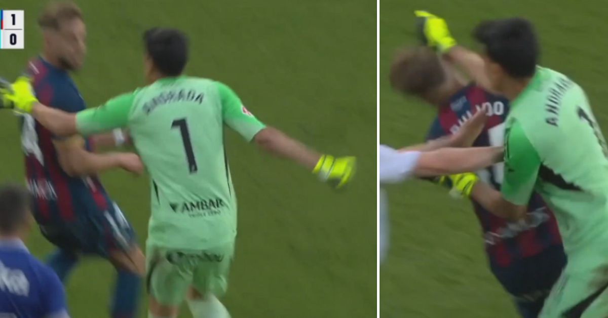 Söndagens skandalösa scener orsakades av en knuff nära Huescas straffområde. Zaragozas målvakt Esteban Andrada blev arg och knuffade sin motståndare när domaren försökte kontrollera situationen på VAR-skärmen.