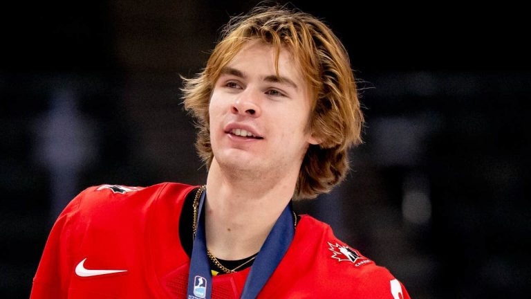 Gavin McKenna under Junior-VM. Den kanadensiske spelaren anses vara en kandidat för att bli nummer 1 i 2026 års NHL-draft.