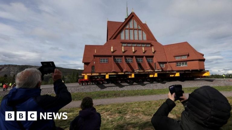 Kiruna stora röda trästruktur, som går tillbaka till 1912, rullas upp av en massiv trailer och är på väg till det nya centrum.