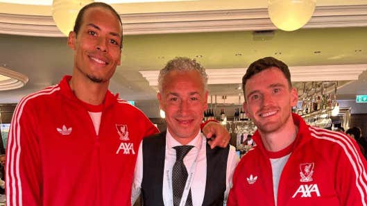 ’Henke’ är smart klädd i kostym, medan Van Dijk och Robertson är i träningskläder.