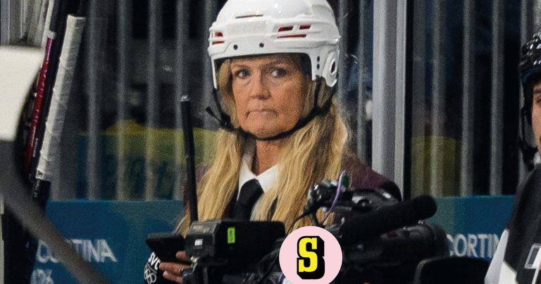 Marie Lehmann bär en stor hjälm som olympisk länkreporter.