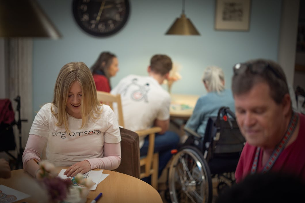 Unga människor, mestadels 14 år gamla, hämtar äldre till sina rum. De rullar ut sina rullstolar i köket, sitter runt bordet och färgar elefanten tillsammans.