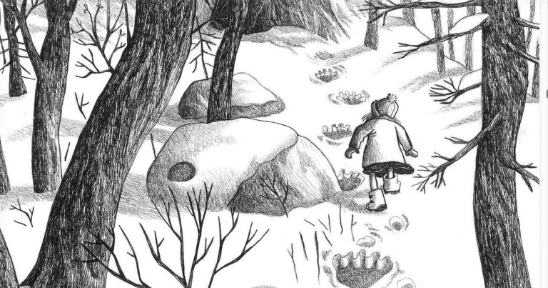 Även den dyrbara kanadensiskan Caroline Merola räknas till den gruppen. Hon debuterade som serietecknare 1986 och har nu översatts till svenska av Maya Joyce. ”Mina och odjuret” är ett bladvändande verk noggrant graverat i blyerts och bläck. Berättelsen handlar om 6-åriga Mina och hennes äldre bror Jerome, som en dag hittar stora fotspår i snön. De är minst dubbelt så stora som björnspår, och de strövar över hela huset och sträcker sig till och med upp till taket. Även där var det någon som tömde komposten och skottade in den igen.