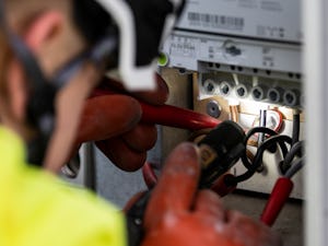 Två elektriker i gula uniformer och hjälmar arbetar vid kontrollpanelen. Den infällda bilden visar en närbild av mannen.