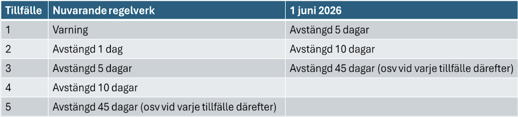 De nya reglerna skärper sanktionerna i både första och upprepade fall. Täckningen kommer att stängas av i 10 dagar för andra gången och 45 dagar för tredje gången.