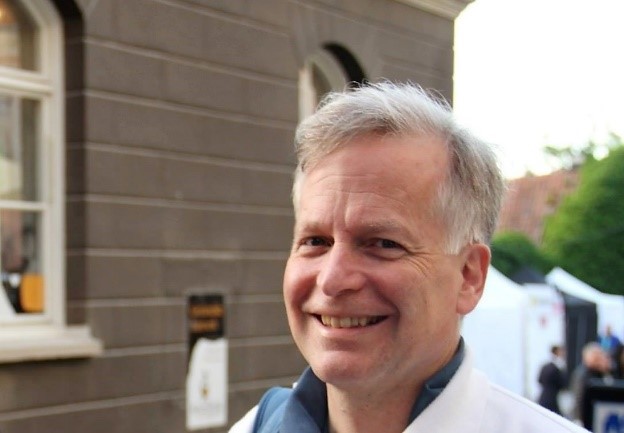 Jesper Sköld står utanför och tittar allvarligt mot kameran. En suddig skolbyggnad skymtar i bakgrunden.