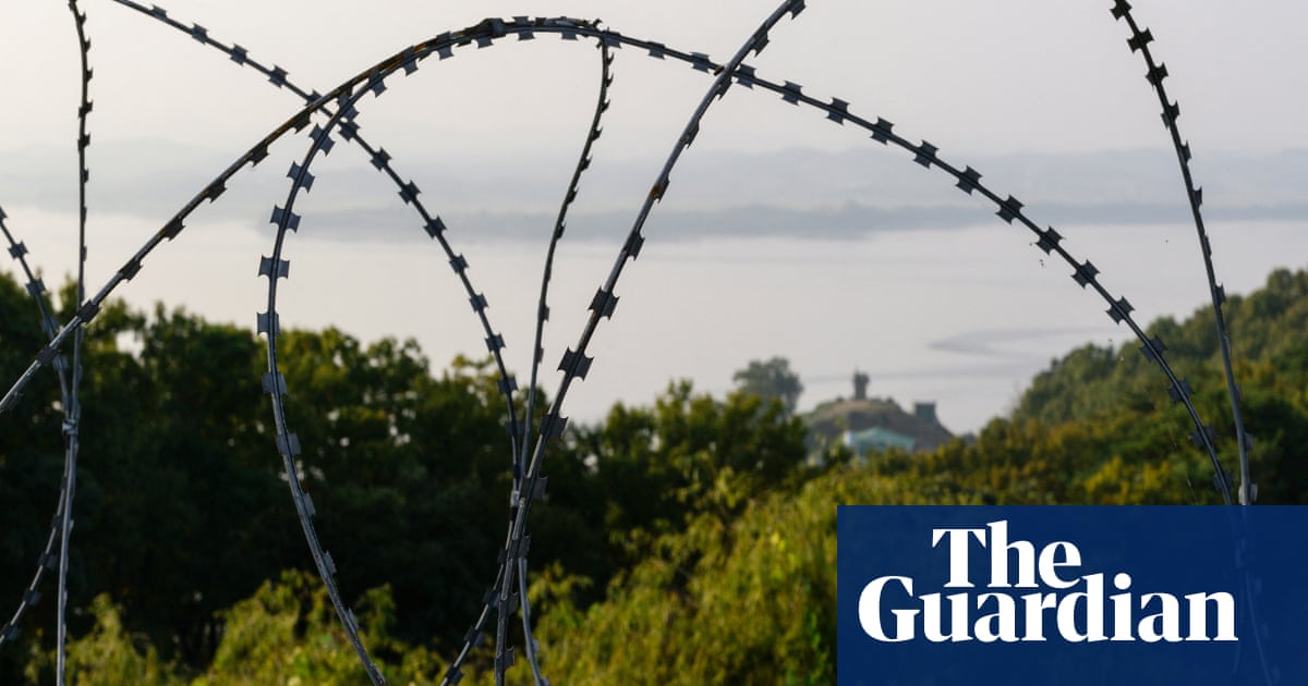 sKim Seung-ho springer över ett litet berg, med utsikt över de stora fälten med risfält som glödar i höstguld, och de mogna kornen svänger försiktigt i vinden. På avstånd sträcker sig Nordkorea bortom horisonten.