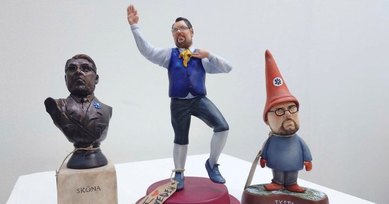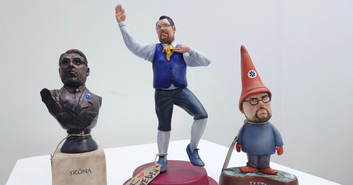 Långt mer kända partiledare dyker upp i den konstnärsdrivna Galleria Metropolitanas monter i snabbköpet. Chilenska Nicolas Miranda smög in en 10 meter hög figur av Jimmy Åkesson, en dansande tomte iklädd knähöga. Noggrant modellerad efter texten till nationalsången. Och i Seattle-baserade Clusters monter förvandlades en grupp pojkar närmast Trump till skrämmande clowner. Bra satir i båda fallen.