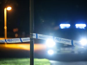 Närbild av svensk spärrtejp och bokstäver "Polisen slår till. Polis - Vänligen korsa inte." Framför byggnaden på natten.